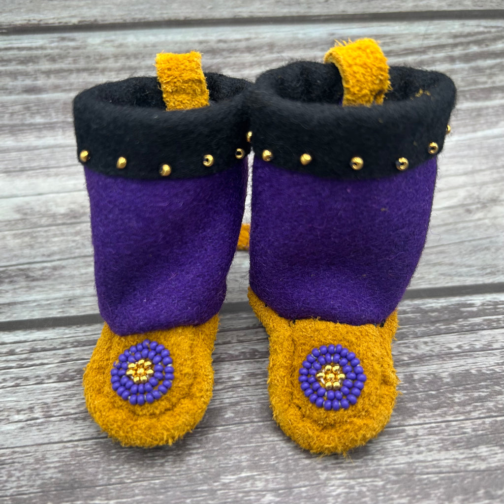 These handcrafted mini mukluks are made from moose hide and melton cloth, accented with 24kt gold beads. Measuring approximately 2.5 inches tall, they are designed to hang from your rearview mirror — a unique blend of tradition, craftsmanship, and charm.