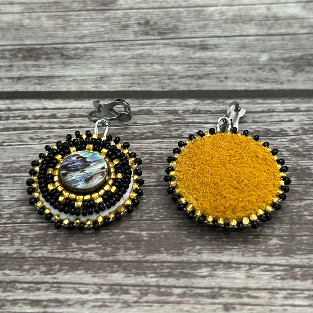 These handcrafted earrings feature a polished abalone shell button surrounded by seed beads and 24kt gold beads. Backed with hide and fitted with 925 silver clip-on findings, they measure approximately 1.5 inches long and 1 inch across.