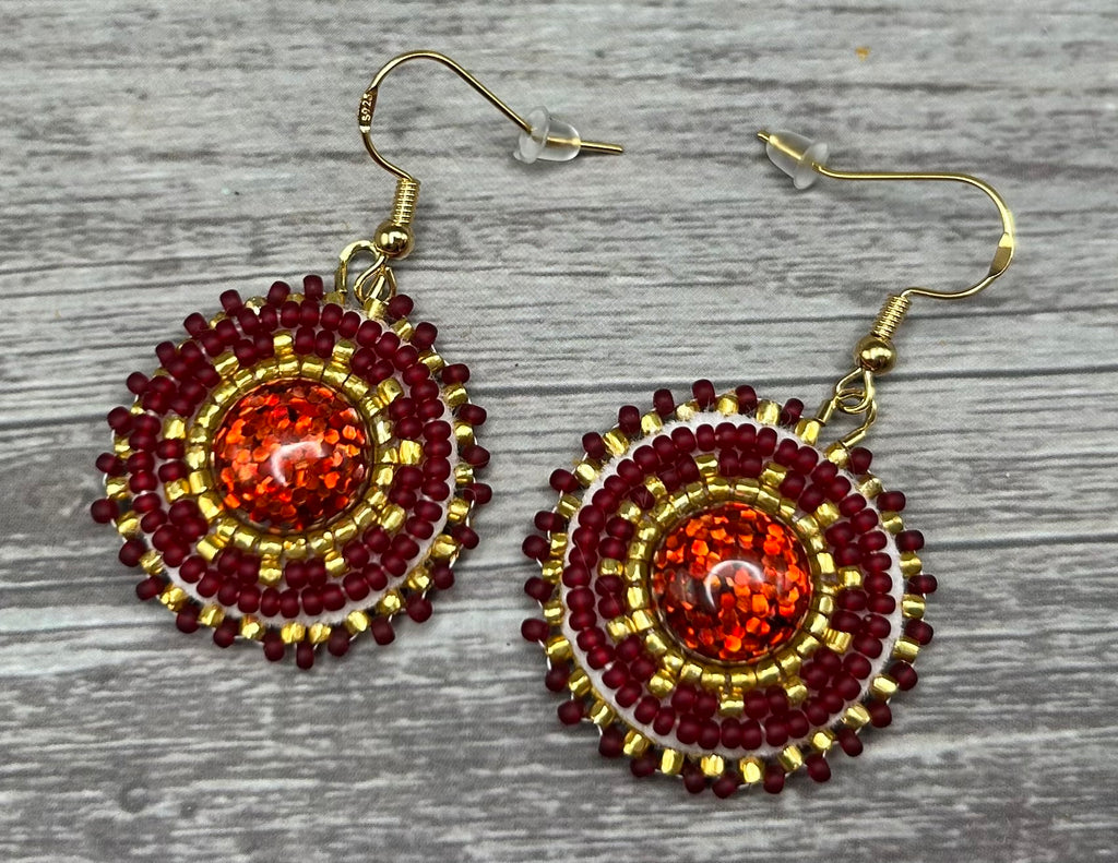 These handcrafted earrings feature a Resin Gem surrounded by seed beads and 24kt gold beads. Backed with hide and finished with 18kt gold hooks, they measure approximately 2 inches long and 1 inch across.
