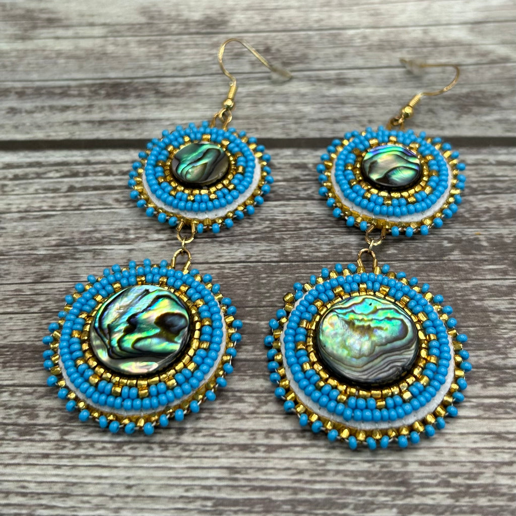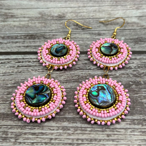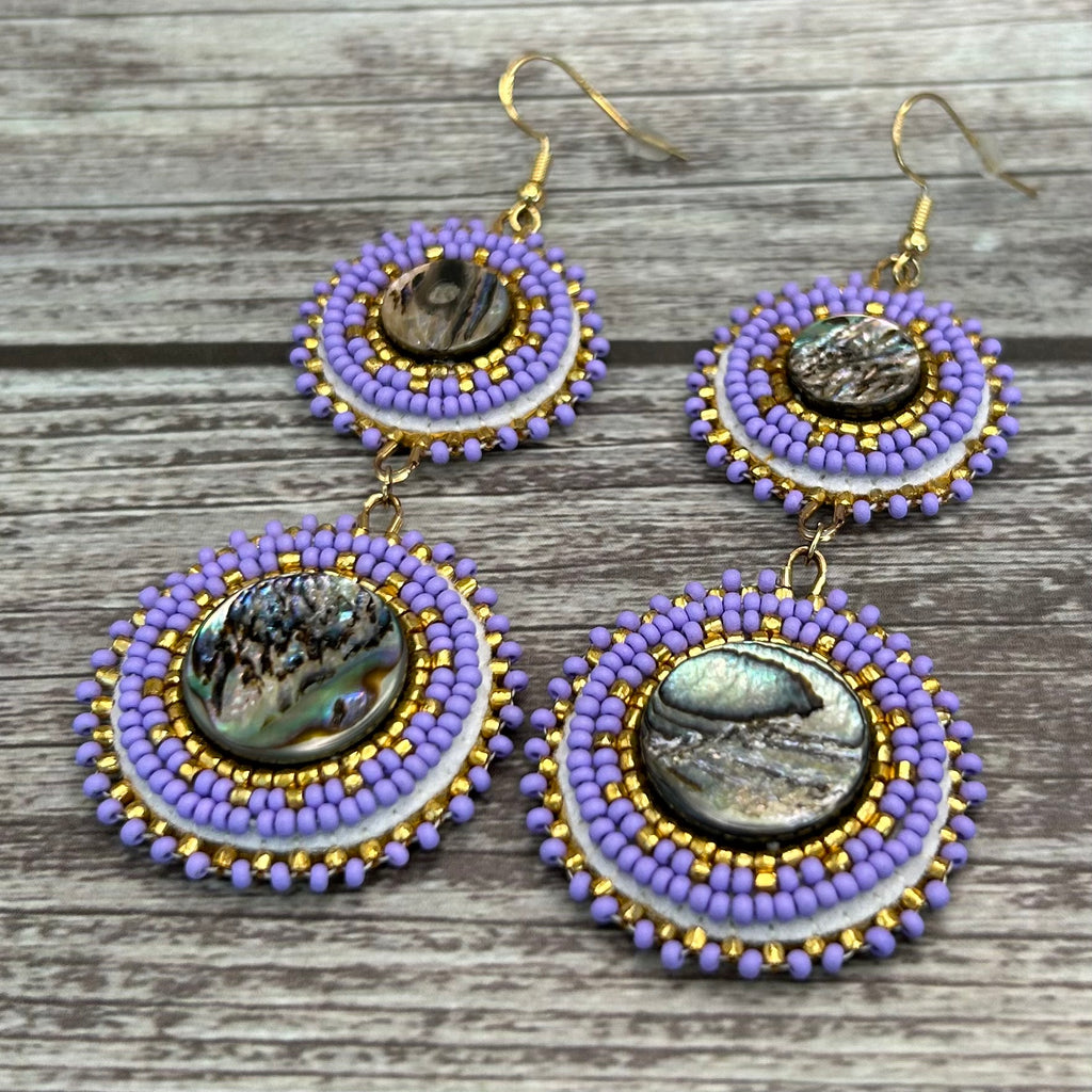 These handcrafted earrings feature a polished abalone shell button surrounded by seed beads and 24kt gold beads. Backed with hide and finished with 18kt gold hooks, they measure approximately 3 inches long and 1 inch across.